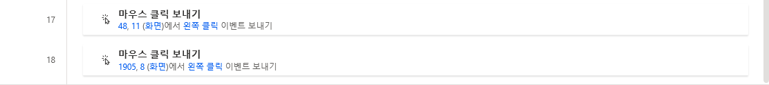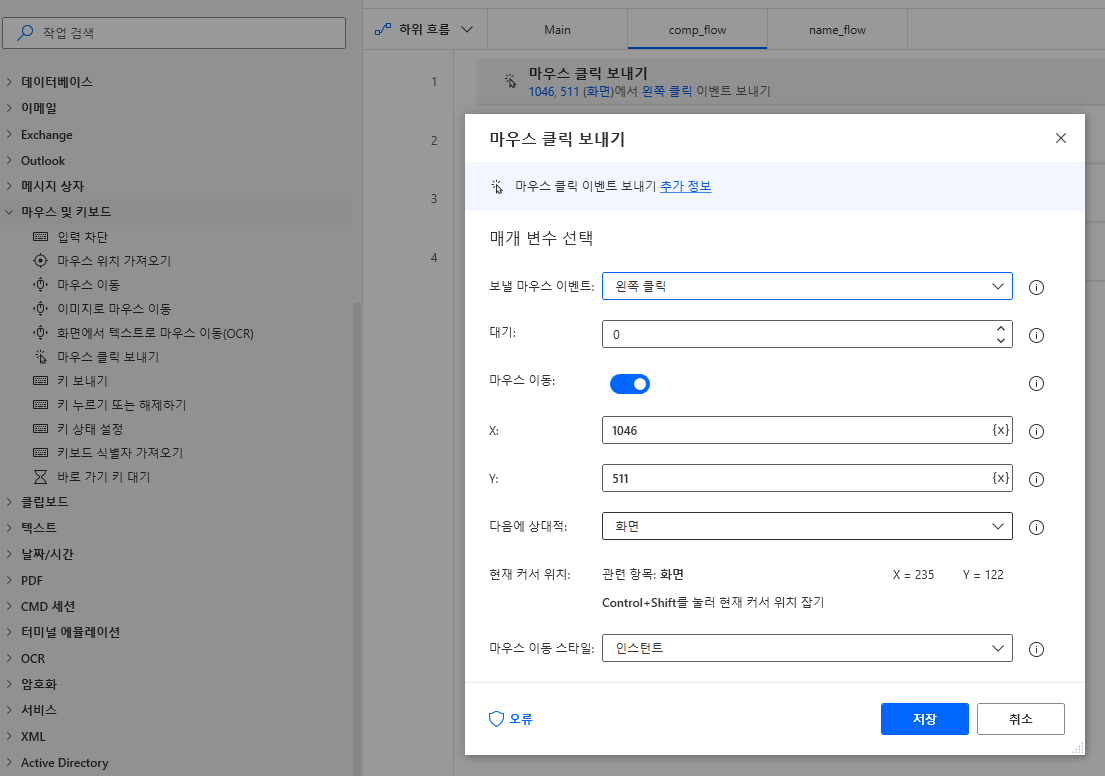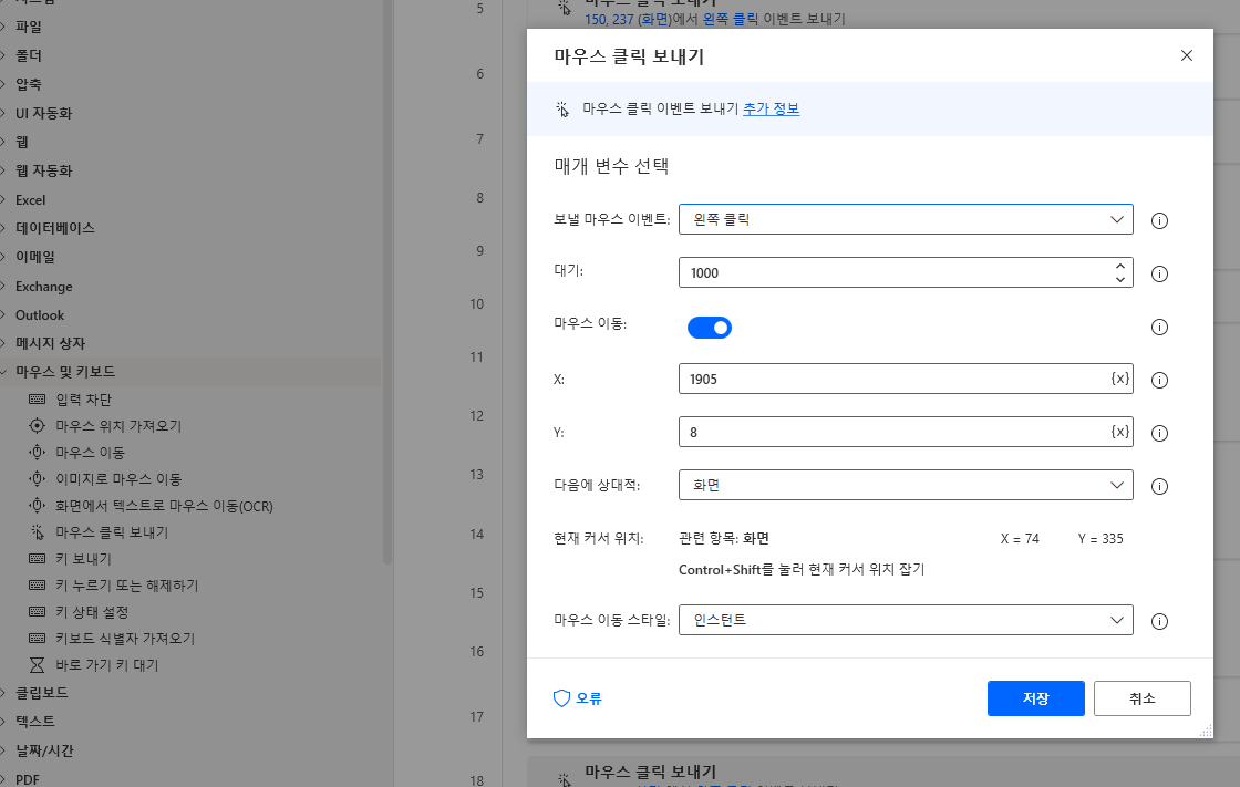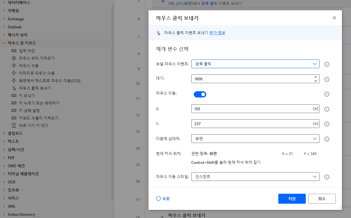 그리고 다시 마우스 클릭 보내기 창으로 돌아오면 X, Y 좌표값이 입력되어 있고 저장합니다.
