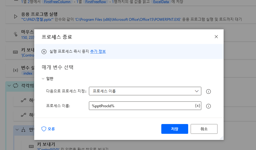 우측 상단 X표 종료 대신 시스템 좌측 메뉴 시스템 > 프로세스 종료에서 응용 프로그램 실행 시 정의된 프로세스 이름 변수를 입력하면 파워포인트를 종료할 수 있습니다.