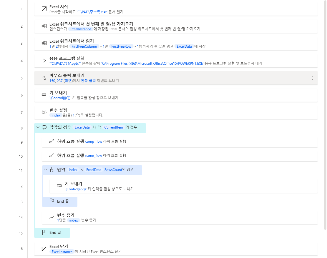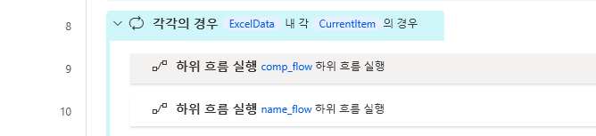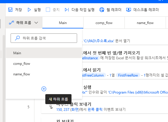 다음은 엑셀에서 가져온 회사명과 이름을 파워포인트에 써야하는 작업을 해야합니다. 그런데 플로어에 이 내용을 추가하면 반복문이 길어져 가독성이 떨어져 회사명 넣는 플로어와 이름을 넣는 플로어를 하위 흐름으로 별도 만들어 반복문안에 넣겠습니다.