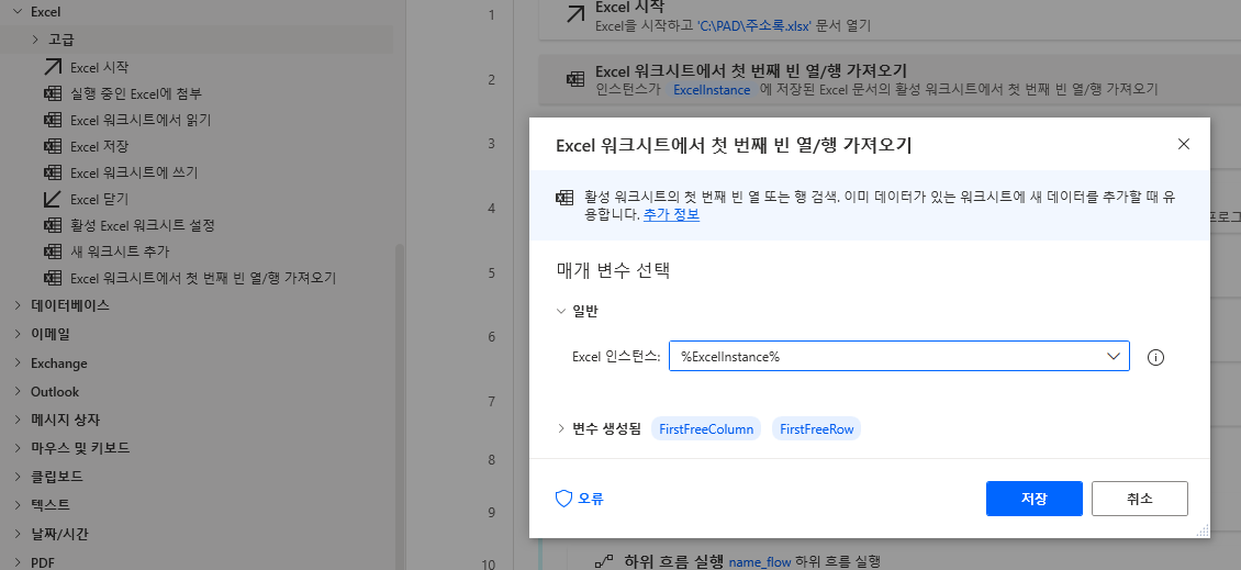 엑셀 데이터를 가져올 범위를 지정하기 위해 좌측 메뉴 Excel > Excel 워크시트에서 첫 번째 빈 열/행 가져오기를 끌어와 저장합니다.