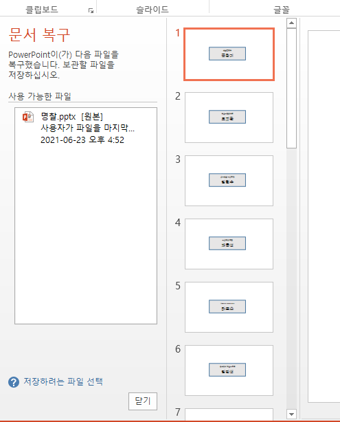 그런데 이와 같은 방법을 사용할 경우 파워포인트에서 비정상 종료로 판단하여 추천하지는 않습니다.