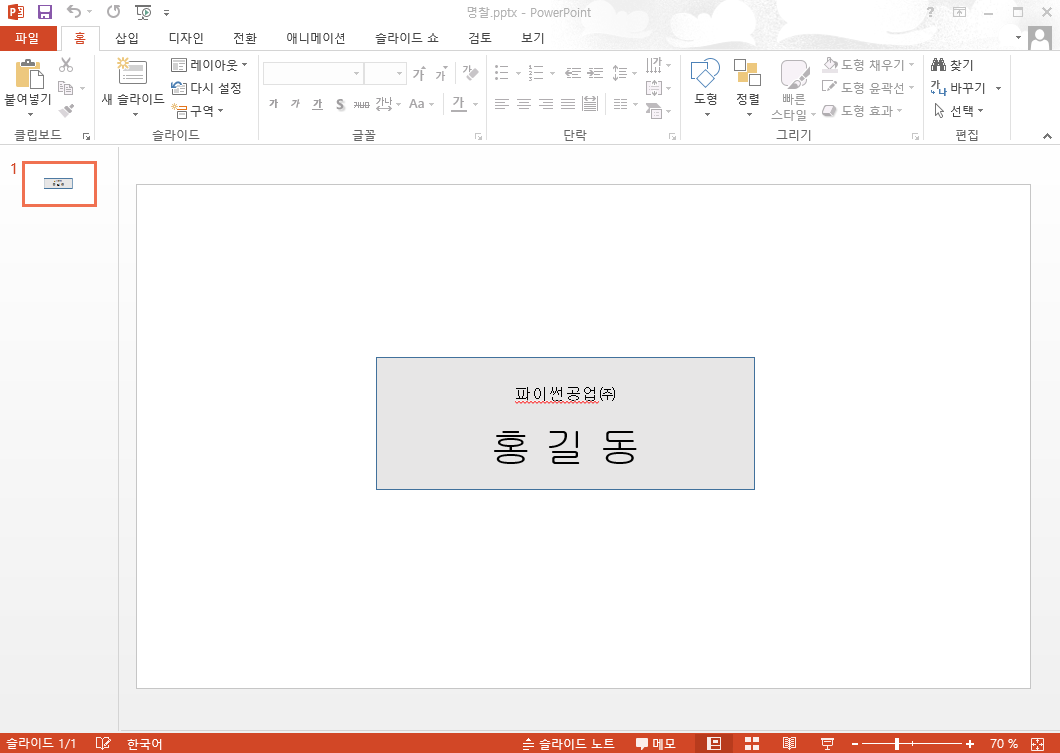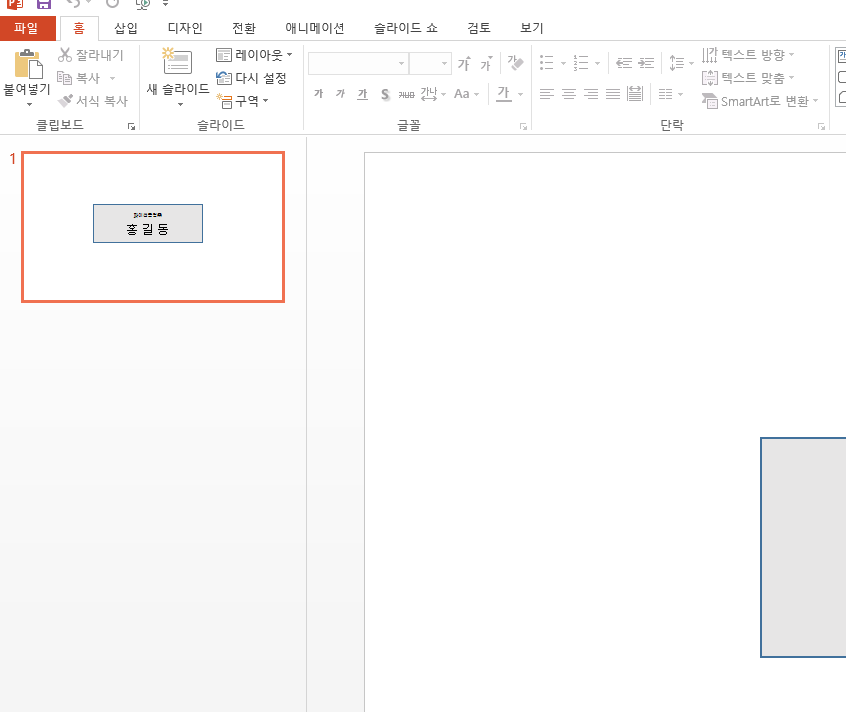 다음으로 마우스 커서가 이동할 좌표값을 입력해야 합니다. 먼저 명찰 폼이 있는 파워포인트를 실행하고 창 크기 최대화를 합니다. 그리고 좌측 슬라이드 탭에 있는 첫 번째 슬라이드에 마우스 커서를 가져간 다음 Ctrl + Shift키를 누릅니다.