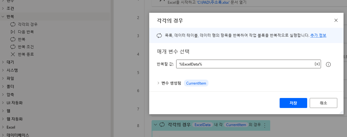 다음 좌측 메뉴 반복 > 각각의 경우를 끌어와 위에서 저장한 엑셀 데이터 변수를 반복할 값으로 선택하여 저장합니다.