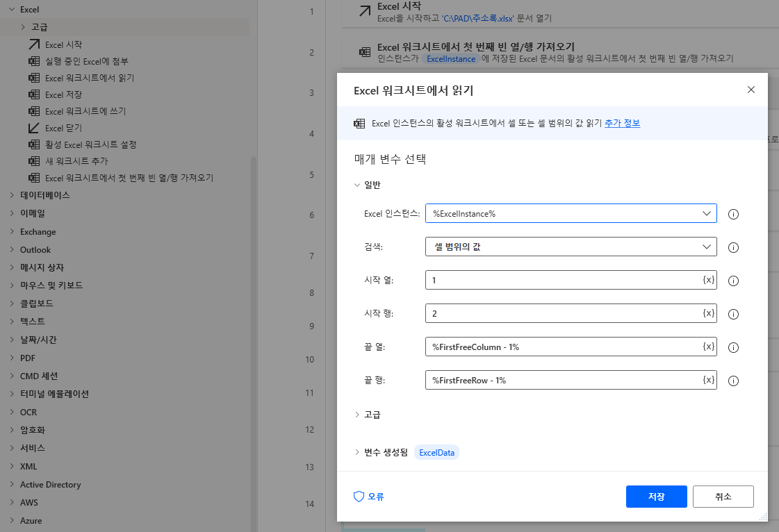 이제 주소록 데이터를 읽어야 합니다. 좌측 메뉴 Excel > Excel 워크시트에서 읽기를 끌어와 셀 범위 값으로 설정 후 시작 행은 2열부터 시작하여 타이틀을 제외하고 마지막 열과 행은 위에서 구한 값을 이용하여 저장합니다.