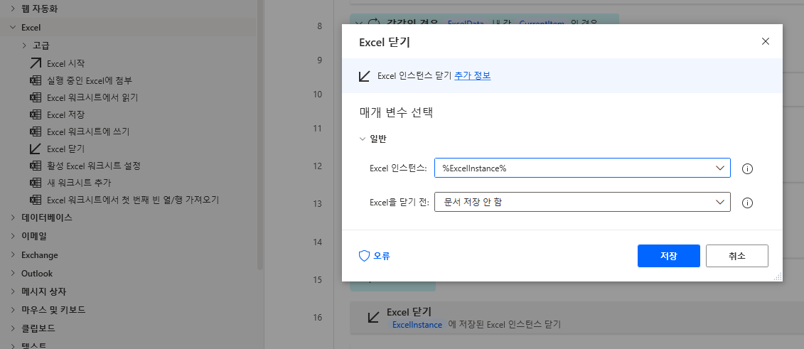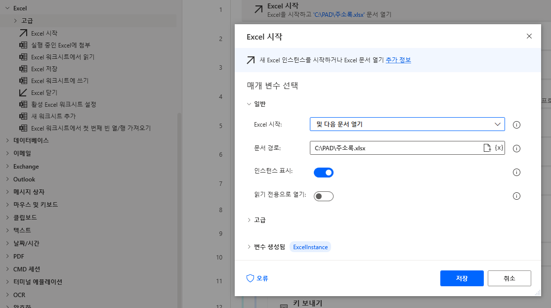 좌측 메뉴 Excel > Excel 시작을 끌어와 엑셀 파일 경로를 입력하고 저장합니다.