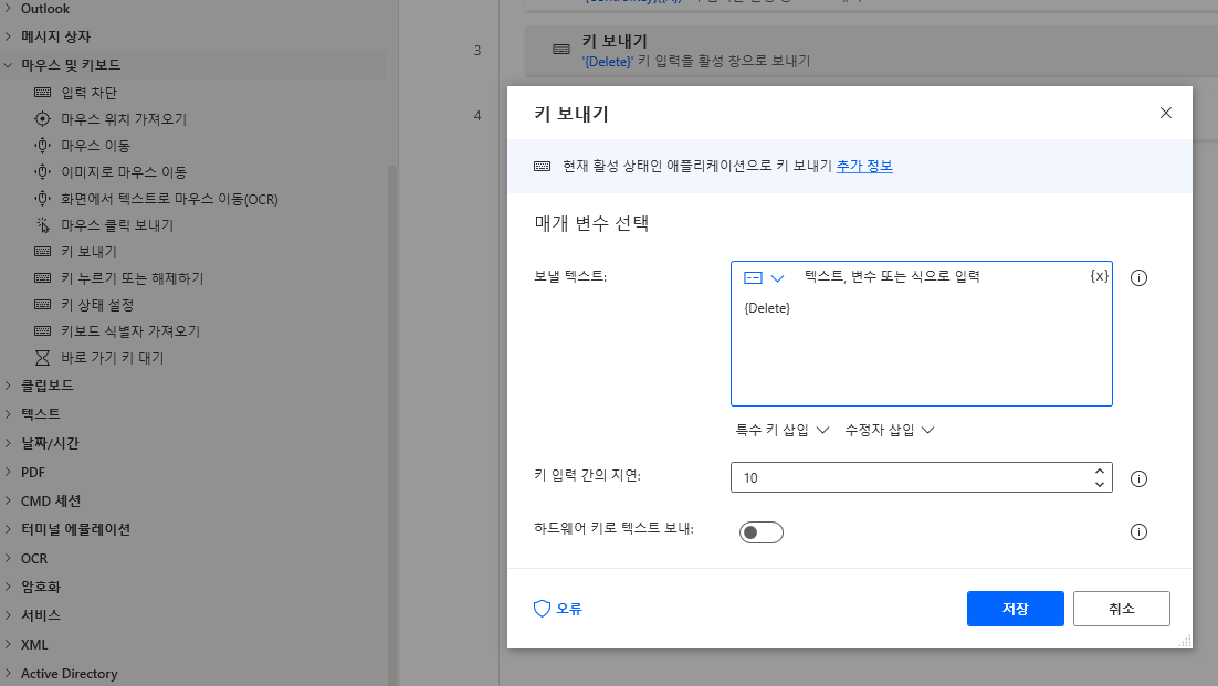 좌측 메뉴 마우스 및 키보드 > 키 보내기를 끌어와 특수키 삽입 > 기타에서 Delete를 선택합니다. 텍스트 상자 내 텍스트를 삭제하는 내용입니다.