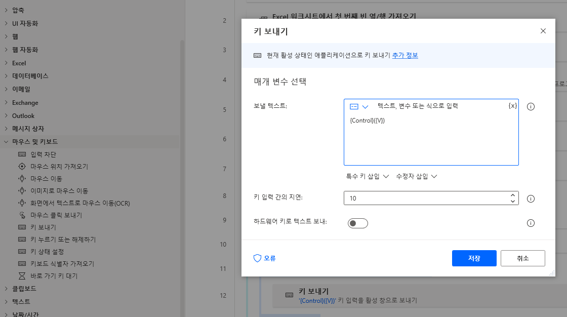 다음으로 위에서 정의한 조건문 안에 슬라이드 복사 작업을 넣어야 합니다. 좌측 메뉴 마우스 및 키보드 > 키 보내기에서 수정자 삽입을 클릭하고 Control을 선택한 다음 마지막에 ({V})를 추가합니다.