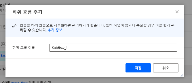 이제 메인 플로어로 돌아와 반복문 안에 좌측 메뉴 흐름 제어 > 하위 흐름 실행을 끌어와 위에서 생성한 하위 흐름 변수를 선택하고 저장합니다.