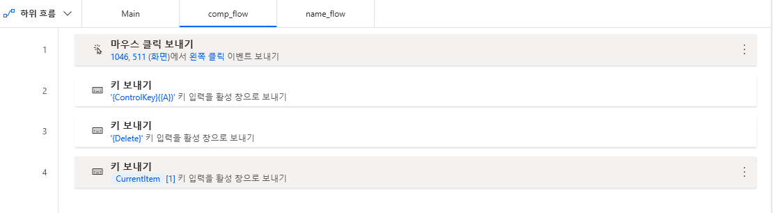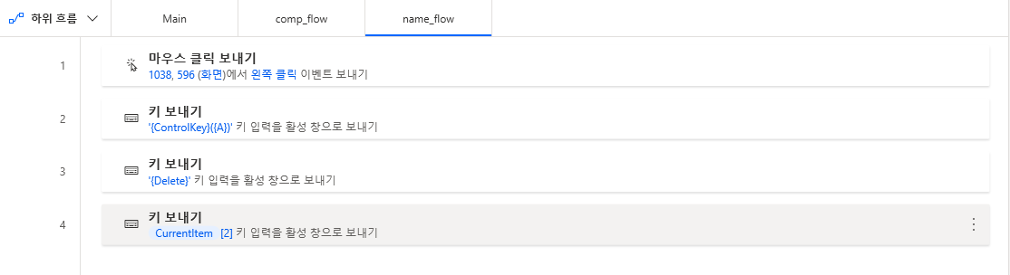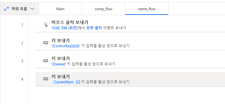 그렇게 되면 상단 탭에 하위 흐름이 생기고 여기서 반복문 안에서 처리할 작업 플로어를 생성합니다.