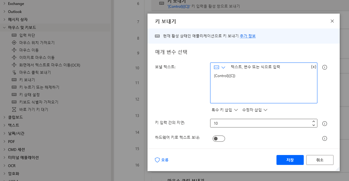 다음으로 해당 슬라이드를 클립보드에 복사해야 합니다. 좌측 메뉴 마우스 및 키보드 > 키 보내기를 끌어와 수정자 삽입을 클릭하여 Control를 선택합니다. 다음으로 끝의 ( )안에 {C}를 입력하고 저장합니다.