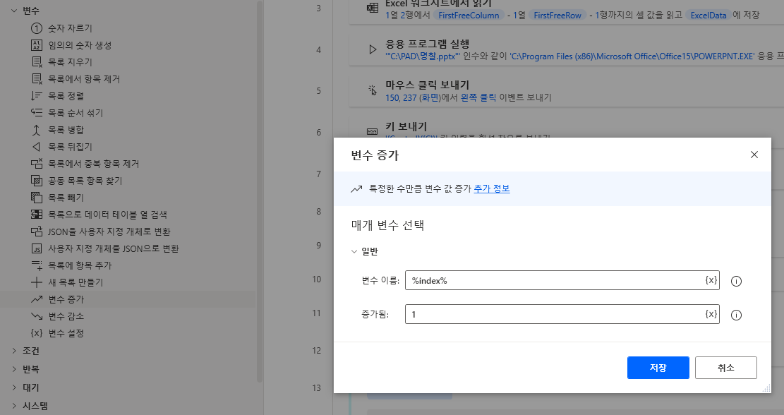 다음으로 좌측 메뉴 변수 > 변수 증가를 끌어와 위에서 정의한 index 변수를 1 증가시킵니다.
