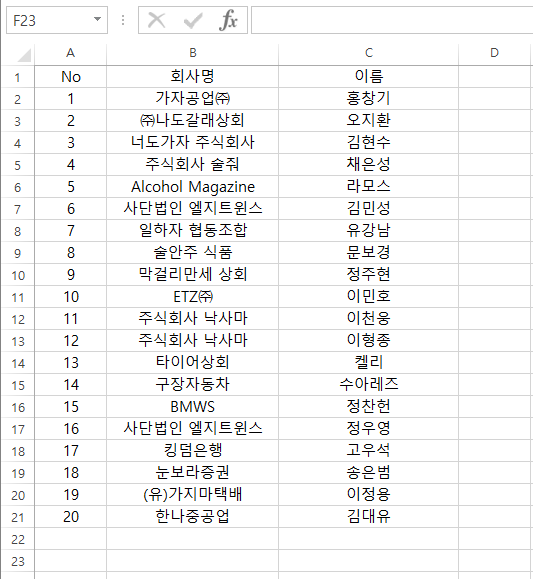 이렇게 하면 엑셀에 있는 주소록 데이터를 변수에 저장하는 작업이 완료됩니다.