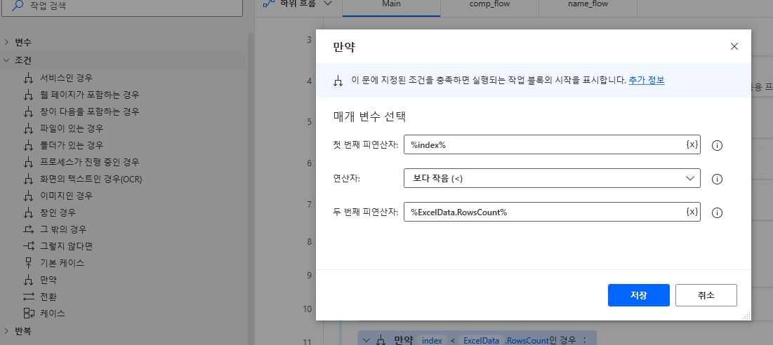 다음으로 좌측 메뉴 조건 > 만약을 끌어와 위에서 등록한 변수와 엑셀에서 읽은 변수의 총 행수를 비교하는 내용을 입력 후 저장합니다.