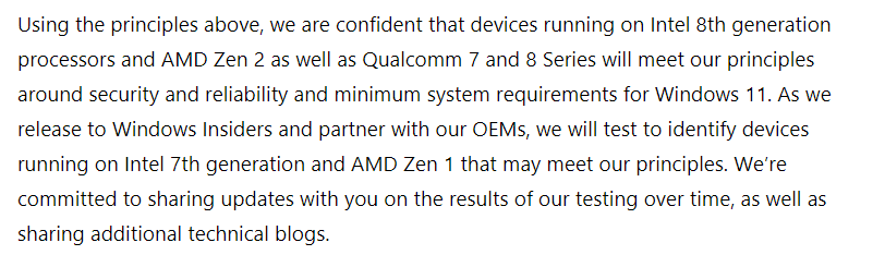 지원 CPU 목록에서 제외 되었던 Intel 7세대, AMD 1세대(Zen1) CPU에 대한 지원여부를 테스트 하겠다고 합니다.
