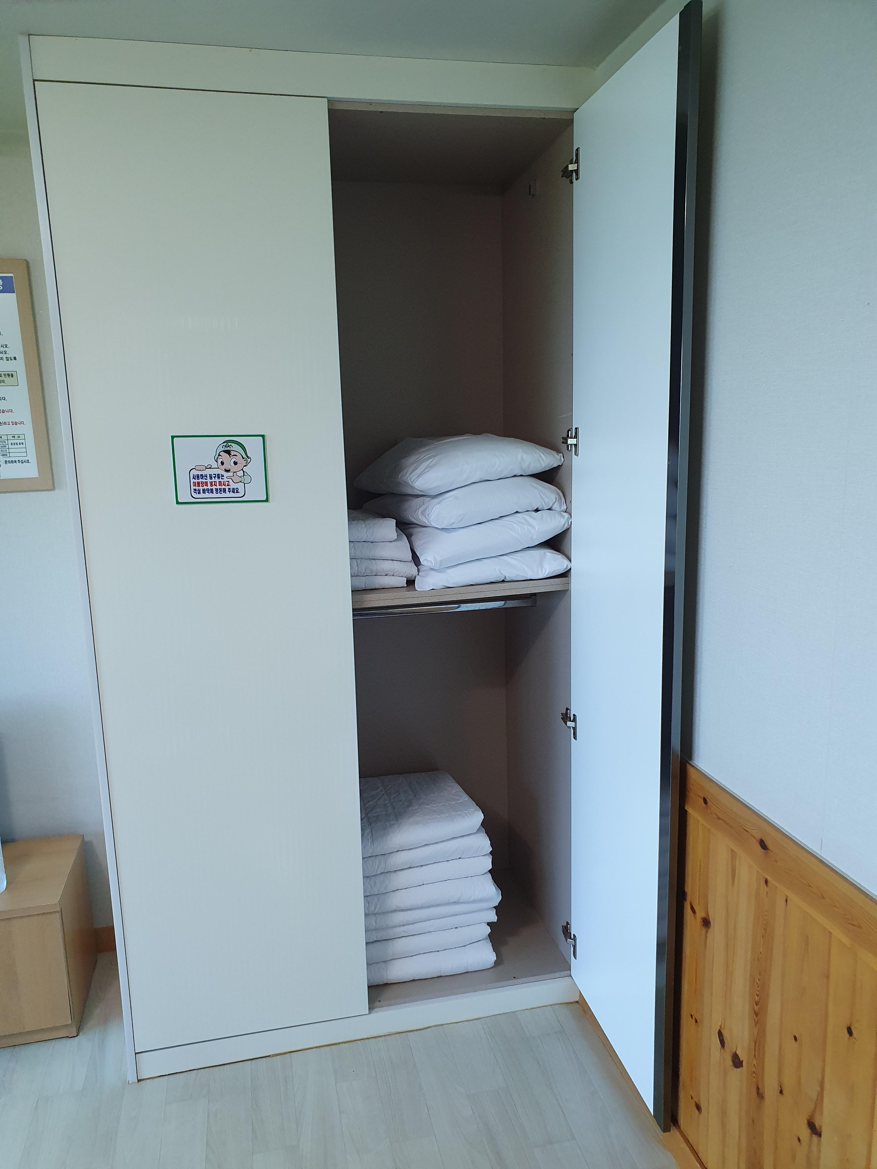 이불장에는 4인이 사용할 수 있는 이불, 요, 베개가 있으며 모두 얇은 재질로 되어 있어 불편할 수도 있습니다. (베개도 낮습니다.)