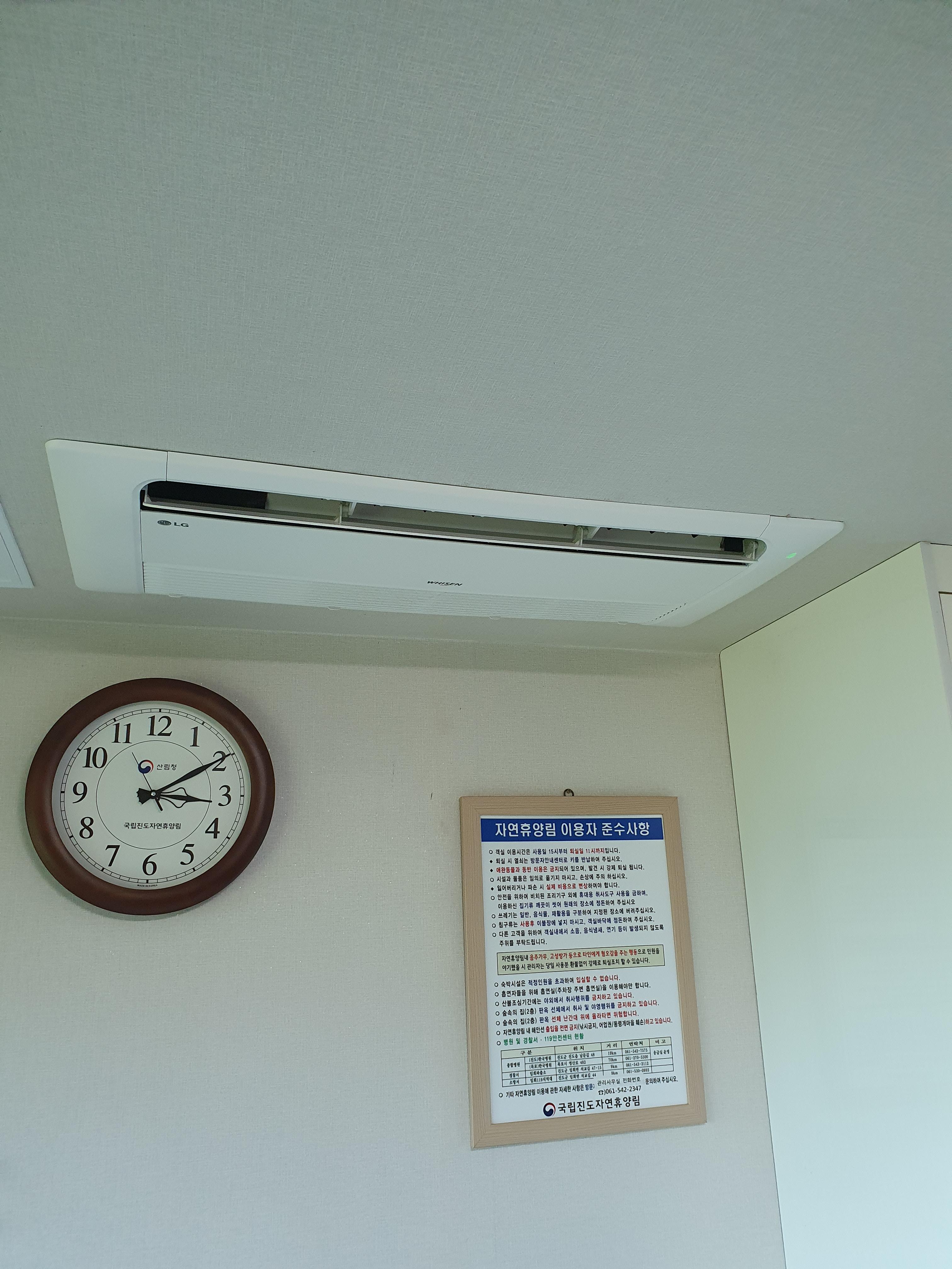 에어콘은 천장에 붙어 있고 위에 사진처럼 선풍기도 비치되어 있어 편리합니다.