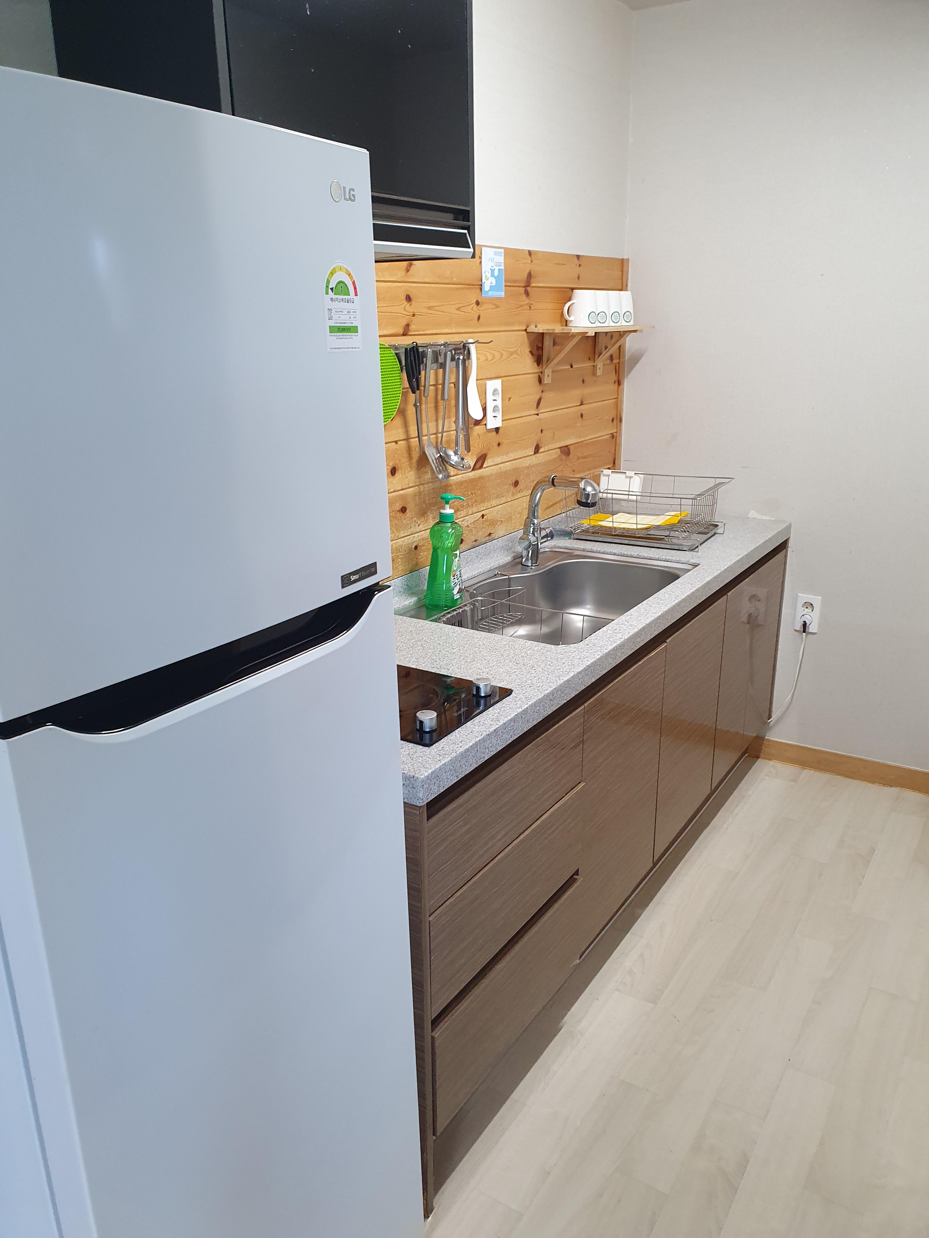 주방에는 냉장고와 각 종 식기류 (싱크대 안에 있습니다.)가 있고 전기 인덕션이 있습니다.