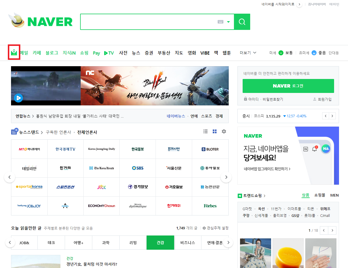 1. 네이버 화면에서 좌측 상단 메뉴의 이메일 아이콘을 클릭하여 메일 메뉴로 들어간다면..