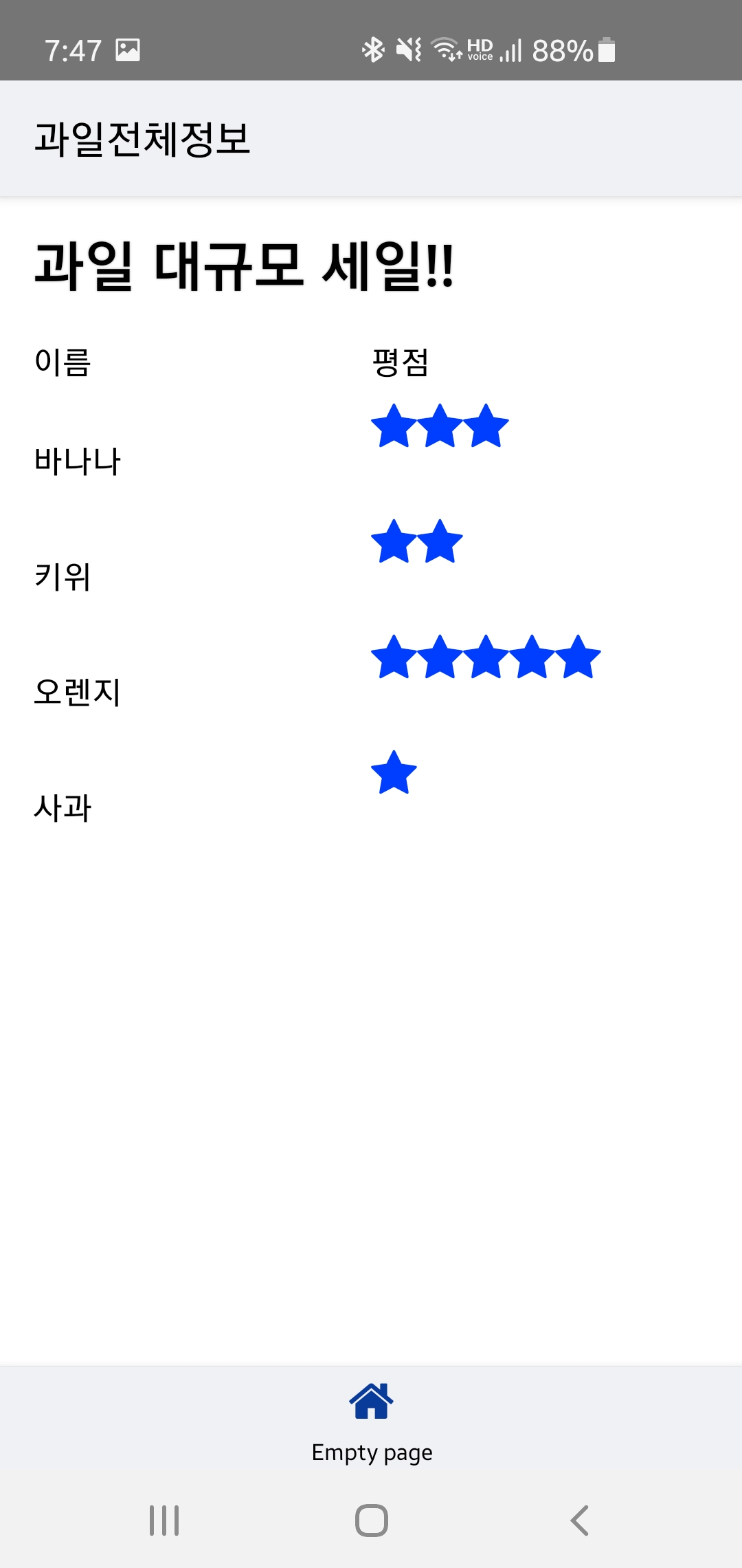 리스트 페이지에서는 과일 이름과 평점을 별 아이콘으로 표시합니다.