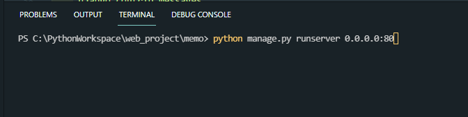 기본 설정으로 django는 8000번 포트에 외부에서 접속을 못하도록 설정되어 있습니다. 포트 번호를 바꾸고 싶거나 외부에서 (다른 PC에서) 접속이 가능하게 설정하려면 아래와 같습니다.