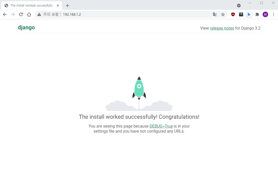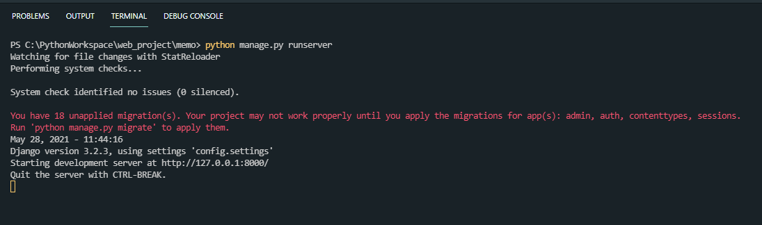 django의 기본 포트는 8000번이며 브라우저 주소창에 http://127.0.0.1:8000 입력 후 접속합니다.