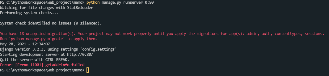 "Error: [Errno 11001] getaddrinfo failed" 에러를 발생하면서 서버가 종료됩니다.