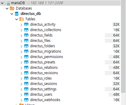 테이터베이스를 보면 directus 관련 테이블을 제외하고 10개의 테이블이 새로 생겼습니다.