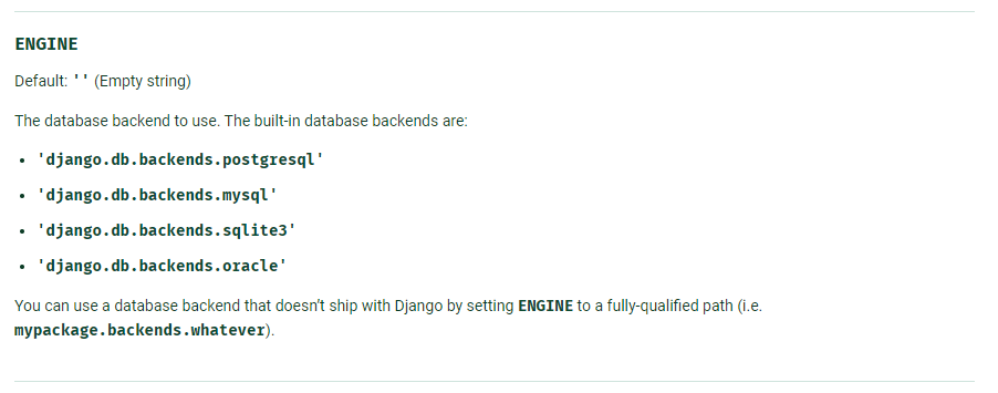 https://docs.djangoproject.com/en/3.2/ref/settings/#std:setting-DATABASE-ENGINE
