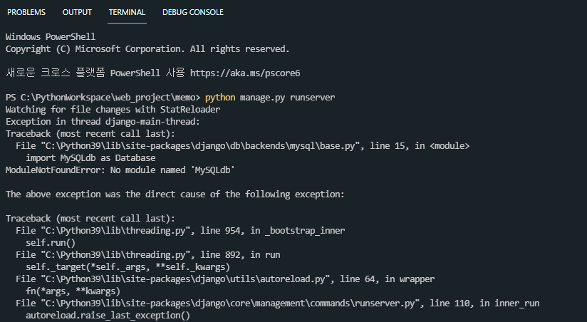 에러는 "ModuleNotFoundError: No module named 'MySQLdb'"