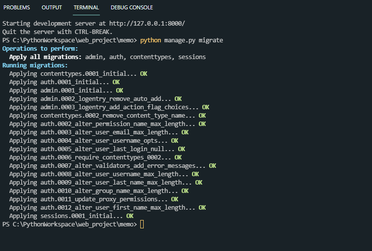django 서버를 다시 실행하면 처음 실행 시 보였던 빨간색 메시지가 없습니다.