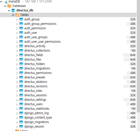 "directus_"로 시작하는 테이블은 데이터베이스 관리 툴인 directus에서 생성한 테이블이니 django와 관련 없는 테이블입니다.