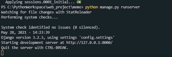 | [Django-Memo] 2. 프로젝트 생성 및 서버 실행 (0) | 2021.05.28 |