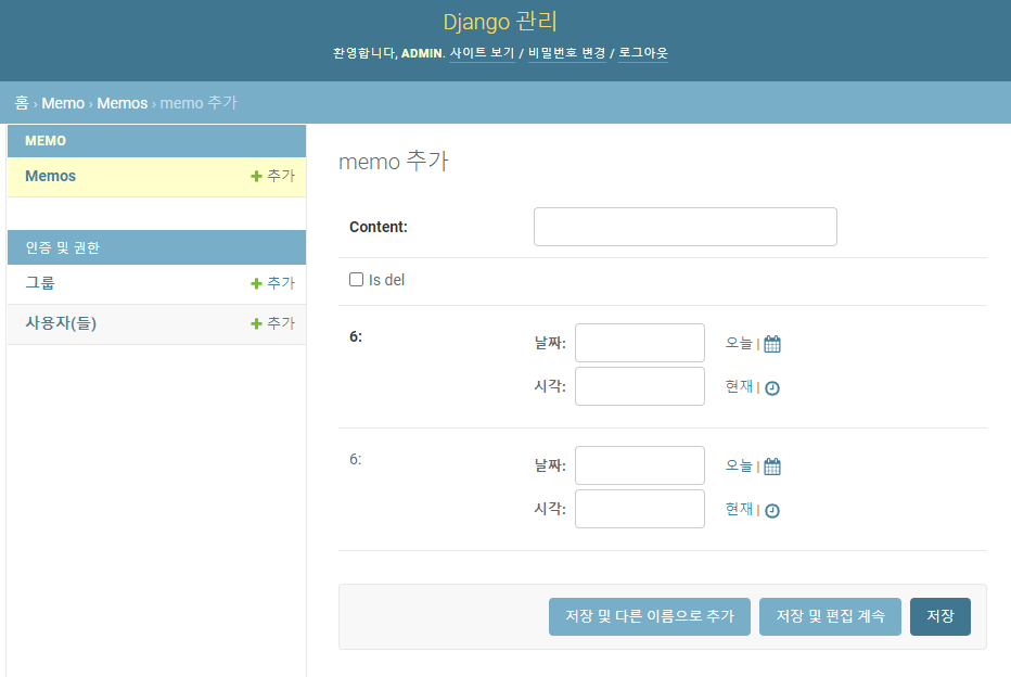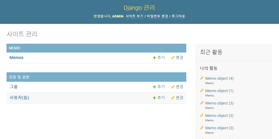 관리자 페이지에 로그인하게 되면 django에서 기본으로 제공하는 auth app관련 테이블과 모델로 생성한 Memo 테이블이 보입니다. 여기에서 테스트에 사용할 데이터를 입력합니다.