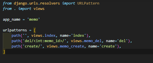 다음으로 메모 등록을 작성합니다. 먼저 memo/urls.py에 메모 등록 path를 추가합니다.