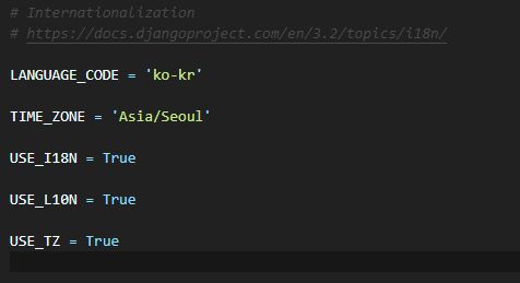 참고로 관리자 페이지가 영문으로 출력되면 "config/settings.py"에서 아래쪽에 "LANGUAGE_CODE"를 "ko-kr"로 수정하면 한글로 출력됩니다. 또한 "TIME_ZONE"를 "Asia/Seoul"로 수정하면 서버 시간이 서울 기준으로 변경됩니다.