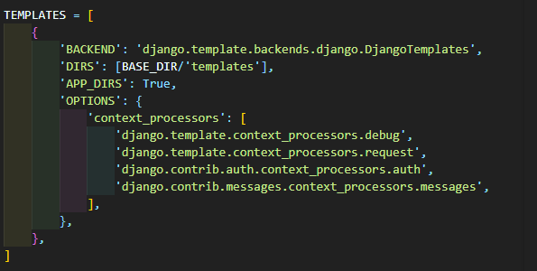 다음으로 memo_list.html을 생성합니다. html 파일은 templates에 생성해야하며 이를 위해 먼저 config/settings.py를 열어 DIRS에 아래와 같이 값을 입력합니다. 이는 BASE_DIR (즉, 프로젝트 루트 디렉토리)의 templates 폴더로 경로를 정의하는 내용입니다.