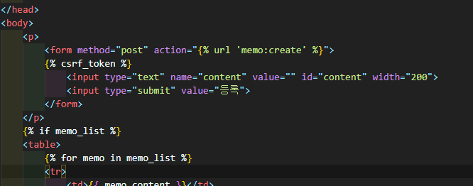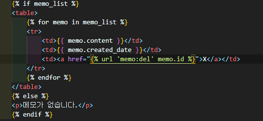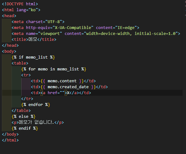 html 파일에서 context 인자로 받은 memo_list를 처리합니다.