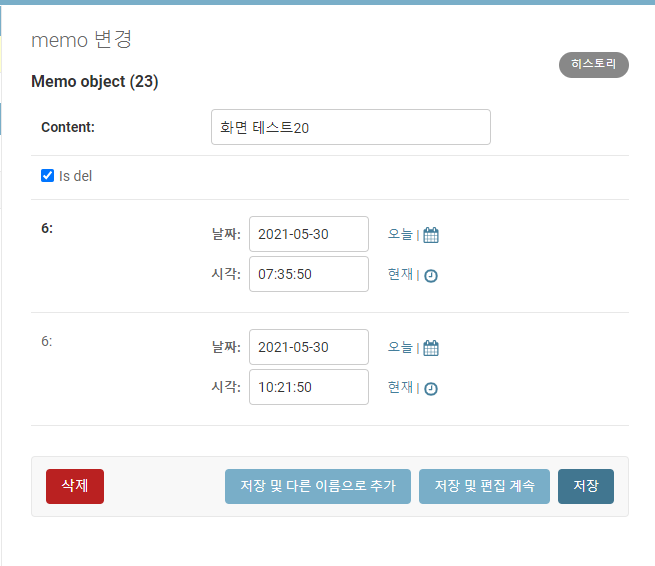 "화면 테스트21"이란 내용으로 메모를 등록합니다.