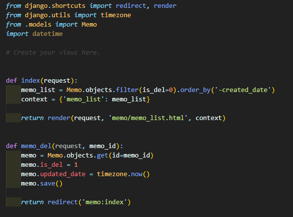 삭제 처리를 위해 memo/views.py을 열어 memo_del 함수를 입력합니다. 메모의 id값을 파라미터로 받아 먼저 해당 값을 조회하고 is_del 값과 수정일자를 변경하여 저장합니다. 그러면 메모 리스트에서는 is_del 값에 의해 해당 메모는 보이지 않게 됩니다.
