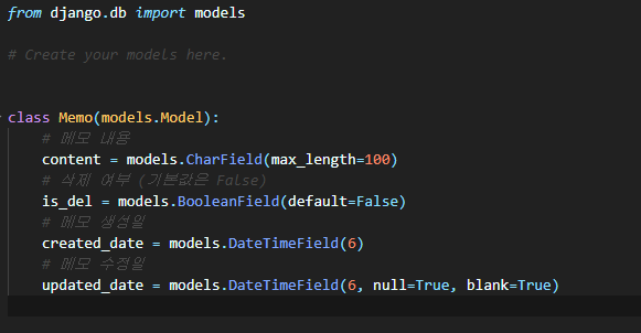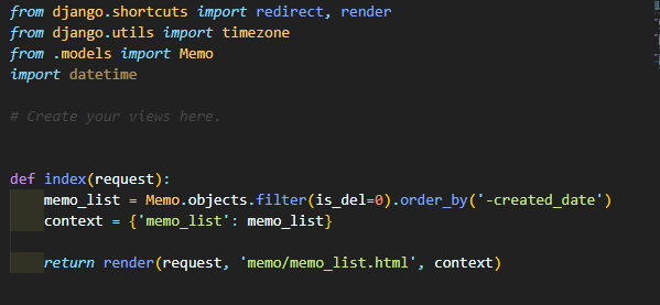 (먼저 Memo 모델을 import) index함수는 request를 인자로 받고 Memo모델에서 is_del=0(삭제 상태가 아닌 메모)인 row를 등록일 내림차순으로 정렬하여 가져와 memo_list라는 변수에 담아 memo_list.html에 html형태로 보내는 뜻입니다.