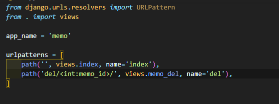 app 이름과 path의 이름은 링크 별칭을 만들기 위한 내용입니다. 예를 들면 html에서 app 이름인 'memo'와 path 이름인 'del'을 조합하여 'memo:del'을 링크로 입력하면 views.py 파일의 memo_del 함수가 이를 처리하게 됩니다.