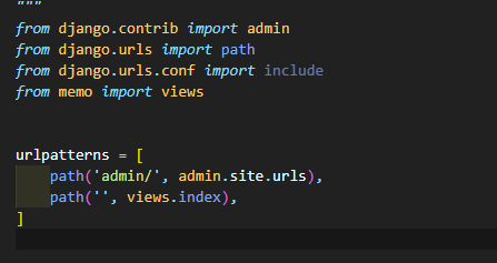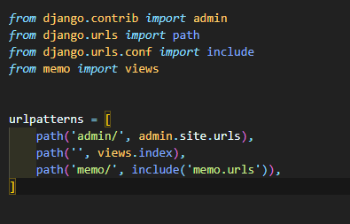 이것은 ''(http://127.0.0.1:8000)으로 접속하는 url패턴에 대해 memo app의 views.py에 index 함수에서 처리하겠다라는 내용입니다.