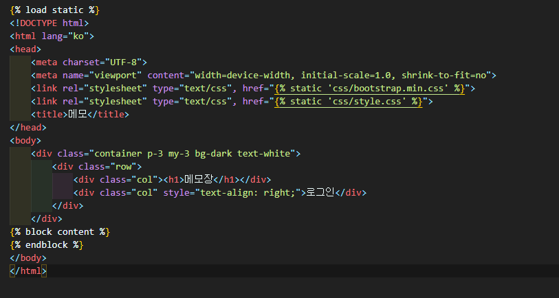 templates/memo/memo_list.html 파일을 열고 bootstrap css 파일을 등록합니다.