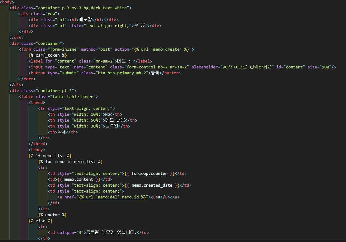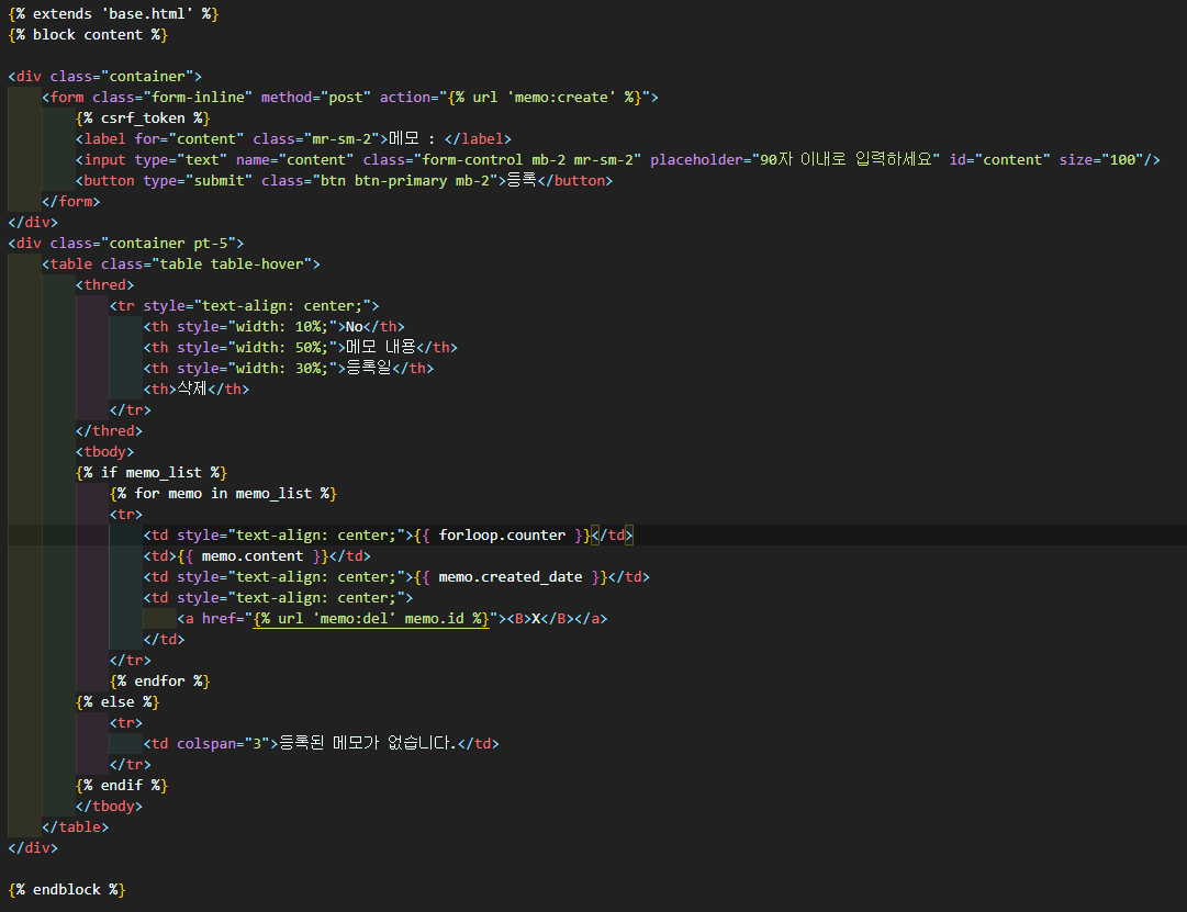 최상단 {% extends 'base.html' %}은 templates/memo/base.html 부분을 넣는 부분입니다.