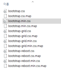 다운 받은 파일의 압축을 풀면 아래와 같은 파일이 나오는데 그 중 "bootstrap.min.css" 파일을 복사하여 위에서 생성한 css폴더에 복사합니다.