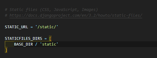 static 폴더를 정의해야합니다. config/settings.py를 열고 STATIC_URL 하단에 아래와 같이 입력합니다.