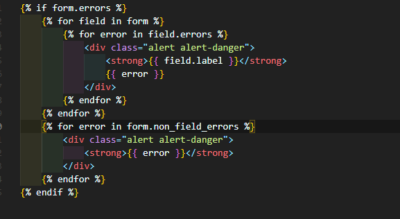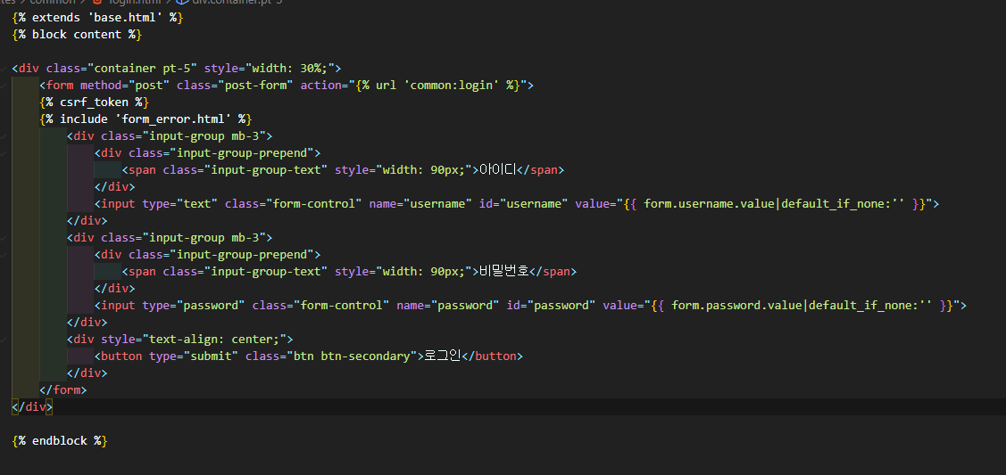 여기서 include 'form_error.html'은 아이디 및 비밀번호가 잘못되었을 때 에러 메시지를 보여주는 공간입니다.