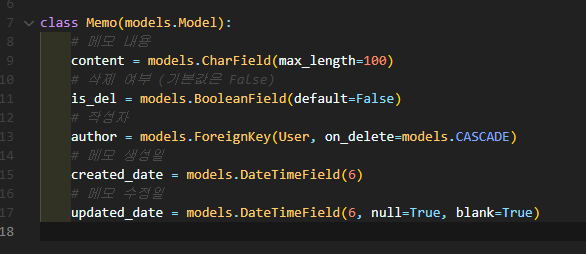 먼저 Memo 모델에 author이란 변수이름으로 django 기본 제공 모델인 User의 ForeignKey로 추가합니다.