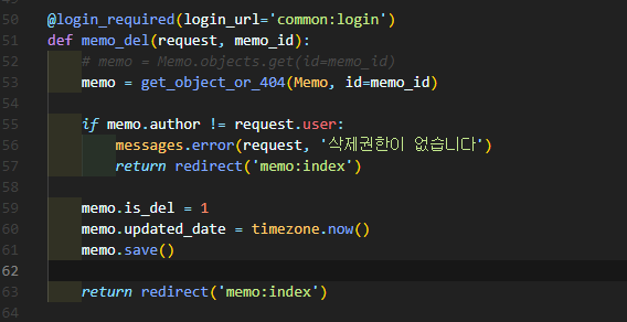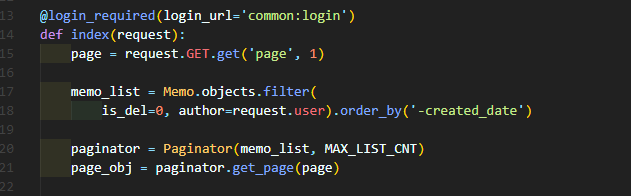 그리고 본인이 작성한 메모만 조회되도록 memo/views.py에 작성자 조건을 추가합니다.