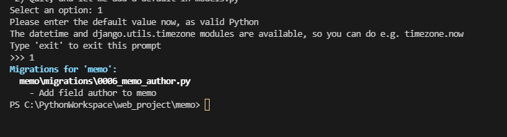 이제 쉘에 makemigrations을 입력하면 아래와 같은 메시지가 나옵니다.